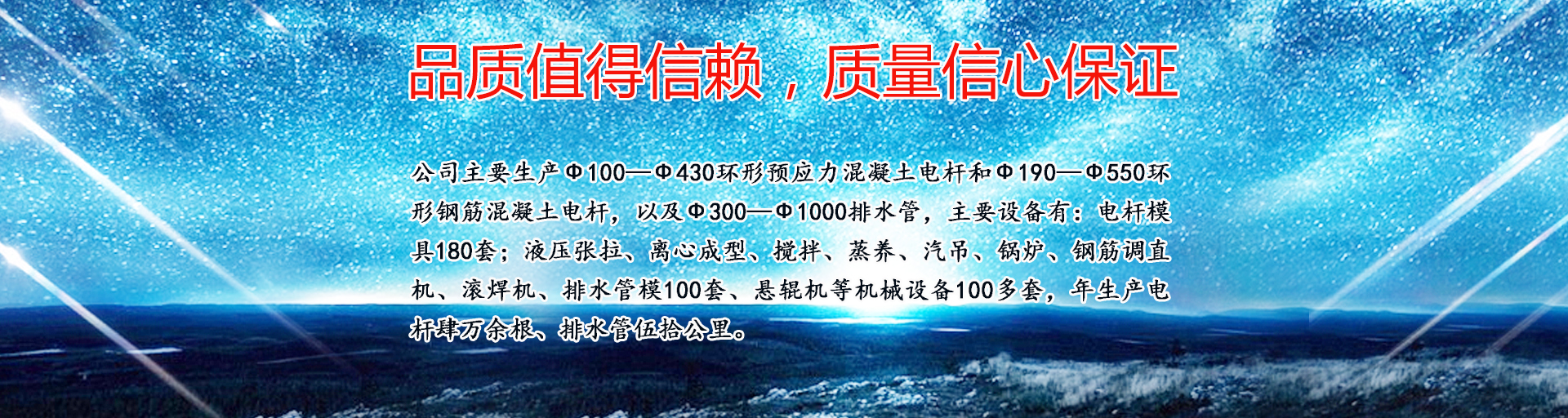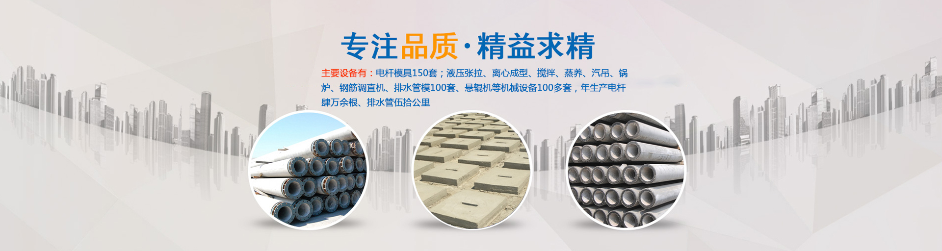 公司主要生產ф100—ф430環(huán)形預應力混凝土電桿和ф190—ф550環(huán)形鋼筋混凝土電桿,以及ф300—ф1000排水管,主要設備有:電桿模具180套;液壓張拉、離心成型、攪拌、蒸養(yǎng)、汽吊、鍋爐、鋼筋調直機、滾焊機、排水管模100套、懸輥機等機械設備100多套,年生產電桿肆萬余根、排水管伍拾公里。……